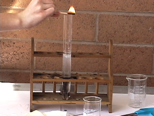 First fill the large test tube 1/4 of the way full of water. Second pour 30 mL sulfuric acid in to a beaker. Third step is to cut 2-3 inch strips of magnesium and place them into the the test tube of water. Fourth pour the sulfuric acid into the test tube; stir with a glass stirring rod so that the magnesium strips are completely covered. Let everything sit for ten to fifteen seconds so that the gas will build up. Fifth step is to light a match and hold it directly over the test tube. If it pops then the experiment has worked, if not then something was done wrong. Last of all, be careful because the material could be very hot.